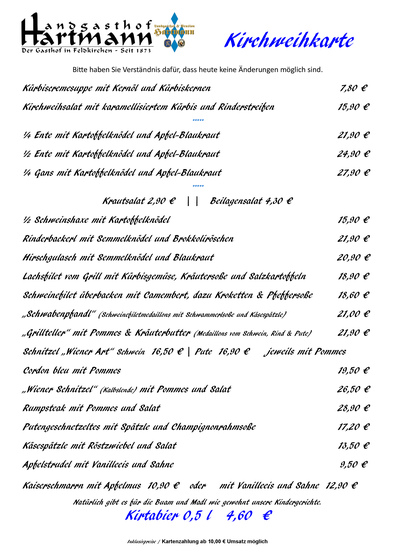 an Kirchweih können Sie nur Speisen aus dieser Karte auswählen.